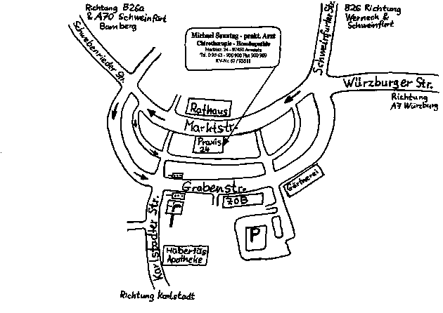 Unsere Praxis liegt im Zentrum von Arnstein gegenüber vom Rathaus. Die Praxisräume befinden sich im 2. Stock. Ein Treppenlift ist vorhanden.